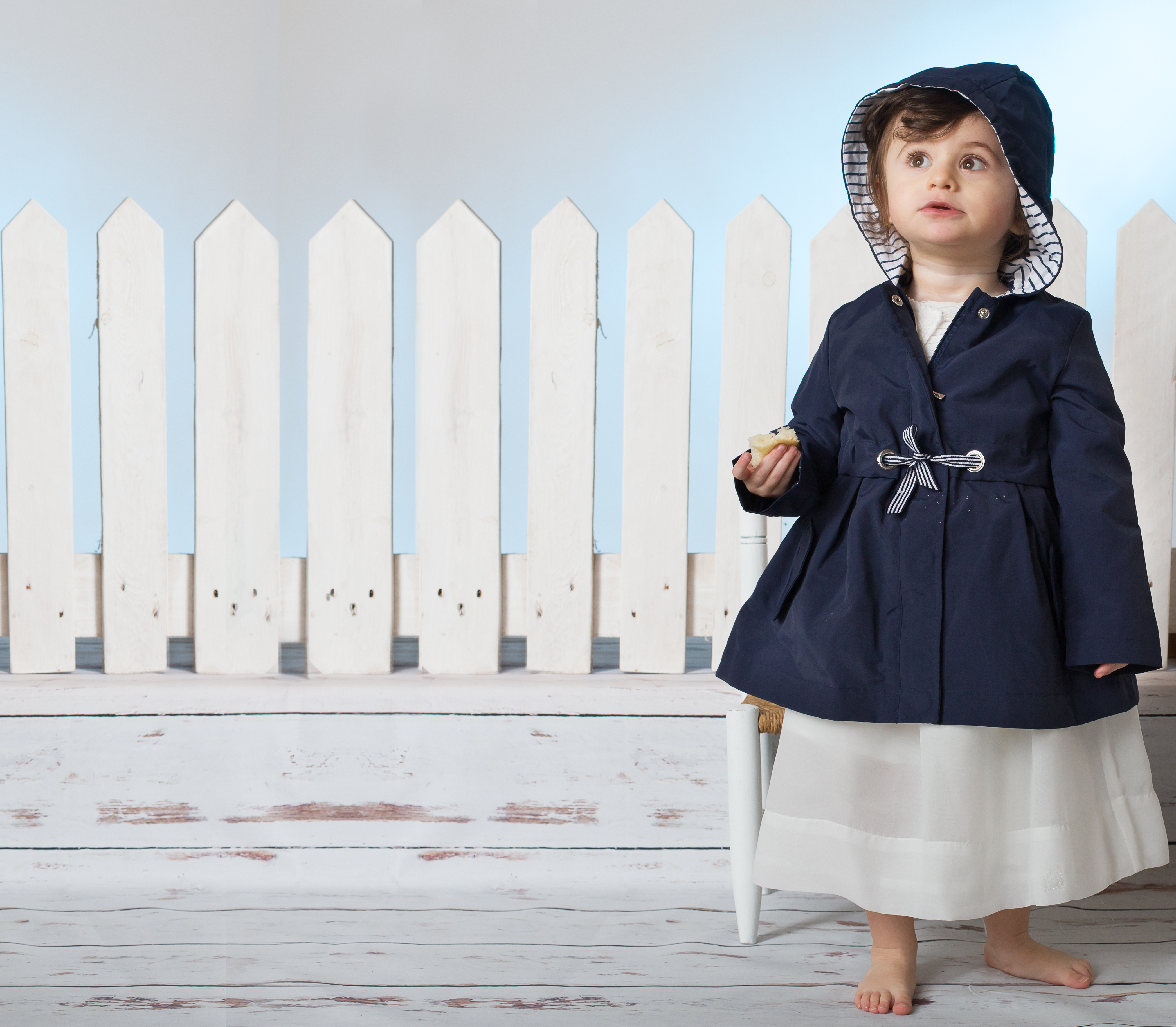 Ho abbinato un delizioso abitino bianco in chiffon e organza ad un semplice scalda cuore in cotone tricot con collo lavorato in maglia. Per completare il tutto ho scelto un modernissimo Parka in nylon blu con dettagli rigati sul nastro e sulla fodera del cappuccio (QUI TUTTI I DETTAGLI SULL’OUTFIT DI LAVINIA)