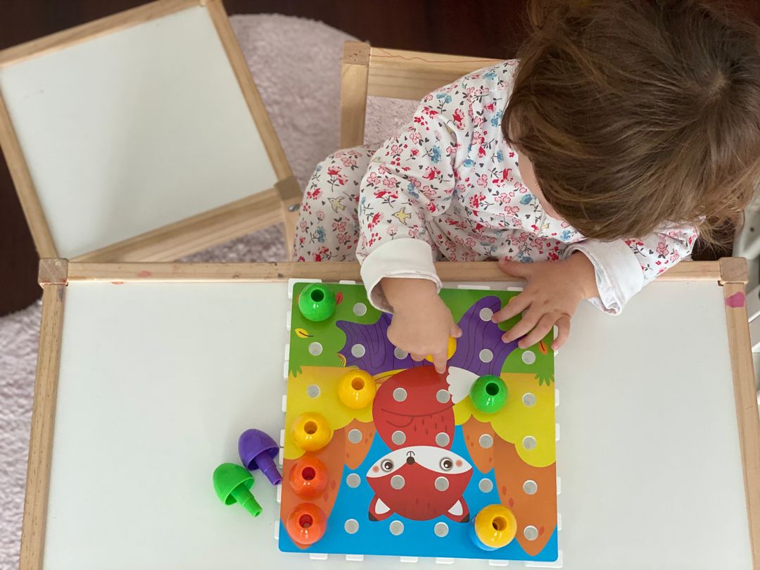 La mia scelta per Lili è ricaduta invece sul Jumbo Peggy che nasce come primo approccio allo storico gioco dei chiodini per i bimbi più piccini come lei. Si compone di 36 chiodi impilabili ovviamente di grandi dimensioni, 9 piastre da incastrare e 4 schede illustrate da entrambi i lati su cui si possono comporre fra l’altro dei mosaici colorati. Le piastre e i chiodi si trasformano anche in un originale gioco di costruzioni (è possibile incastrarli entrambi) con cui sbizzarrirsi a realizzare le torri che Lavi tanto ama e che Lili ancora invece preferisce distruggere! Anche il Jumbo Peggy è un valido gioco da fare in famiglia che permette ai bimbi più piccini come Lili di poter giocare e sperimentare in piena autonomia (i pezzi sono davvero di grandi dimensioni e quindi non pericolosi!). Pone le basi per i più piccoli per lo sviluppo della motricità fine e della coordinazione occhio-mano. Questo giocattolo, come tutta la gamma Quercetti, è totalmente made in Italy.