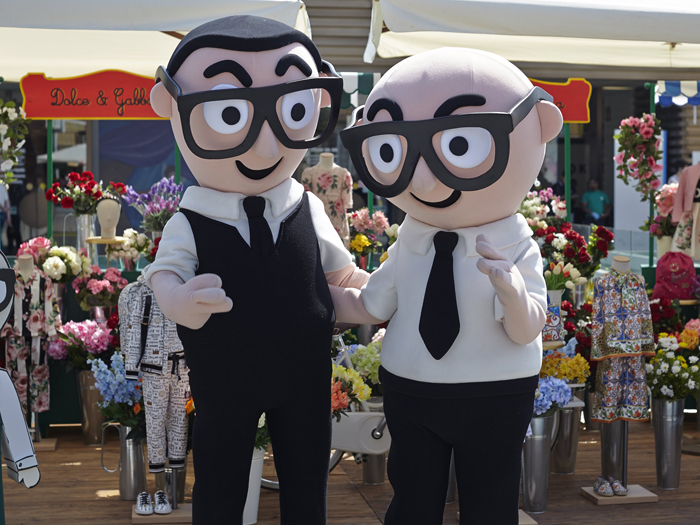 Ovunque fiori colorati, delicate ortensie, boccioli di rose rosse, elementi tra i più cari a Dolce&Gabbana, che per l’occasione ha creato un mercato colmo di fiori di ogni genere e colore. Sembrerà di essere nella piazza di un immaginario paese d’Italia nel giorno del mercato, accolti da due fiorai d’eccezione: a dare il benvenuto le sagome formato cartoon di Domenico Dolce e Stefano Gabbana.